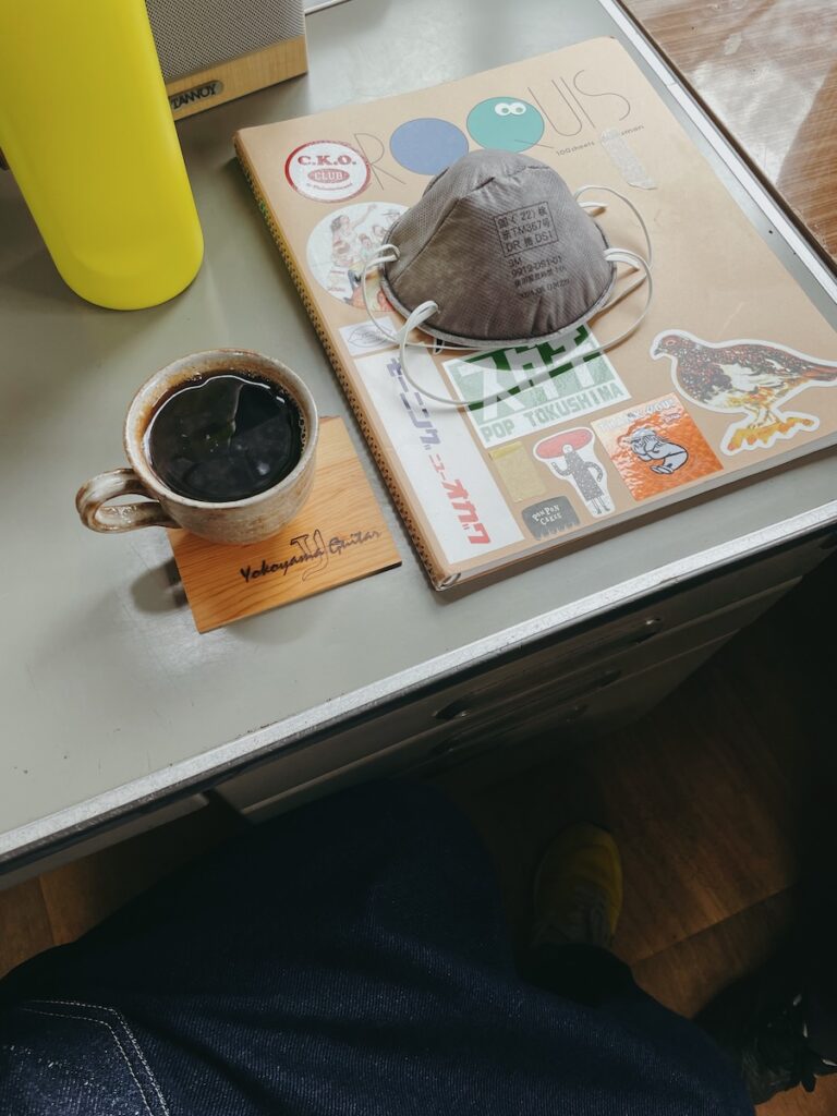 師匠に温かいコーヒーを淹れてもらい、昨日接着した天神板を確認します。