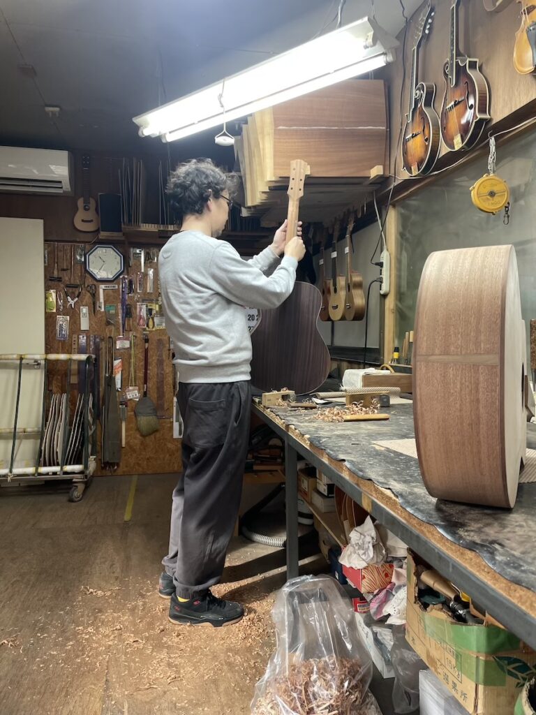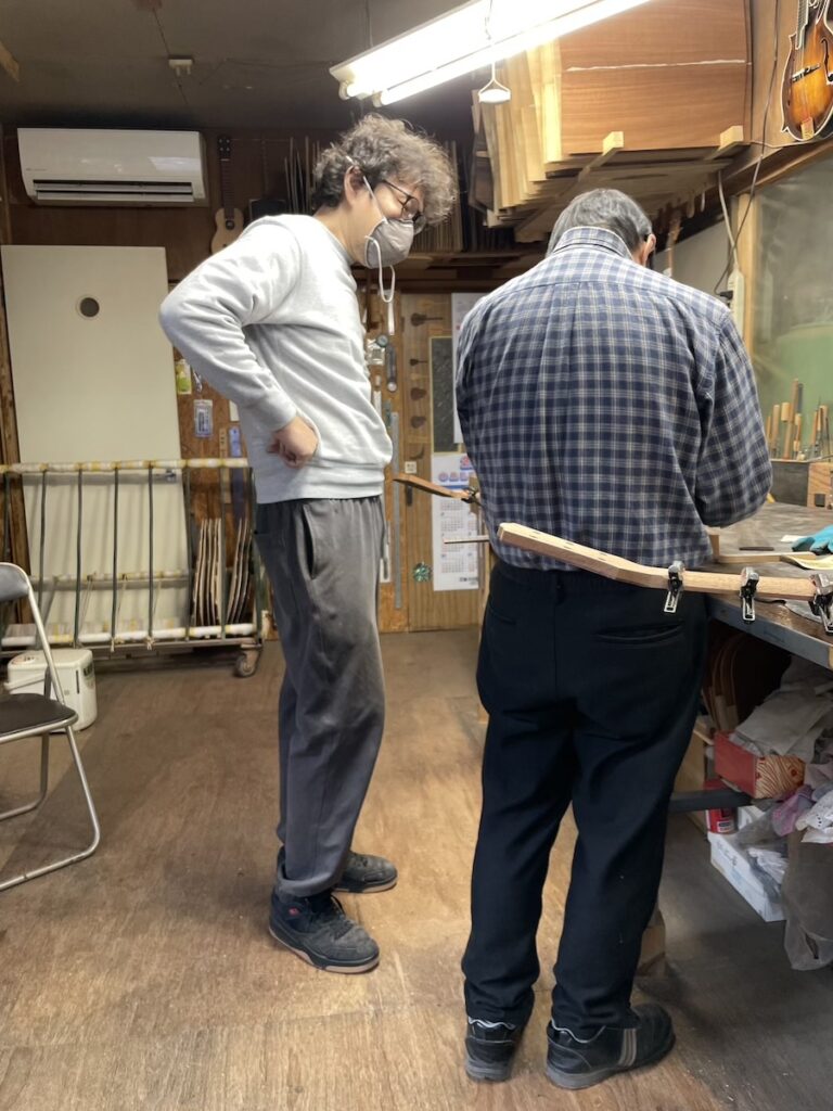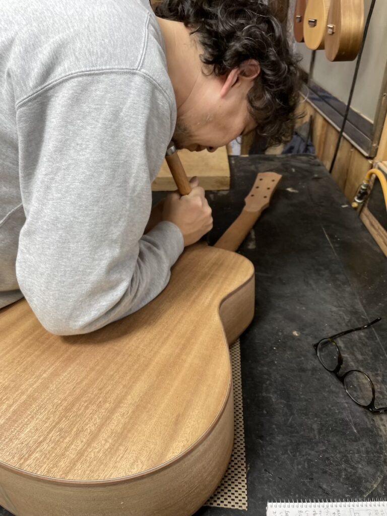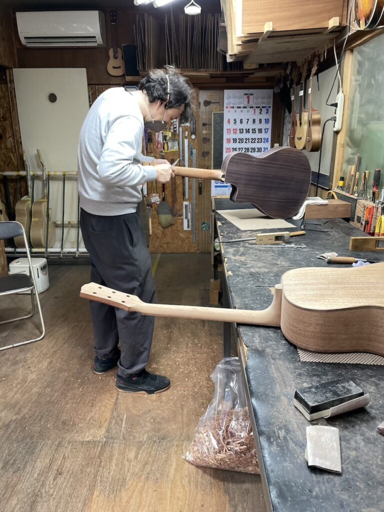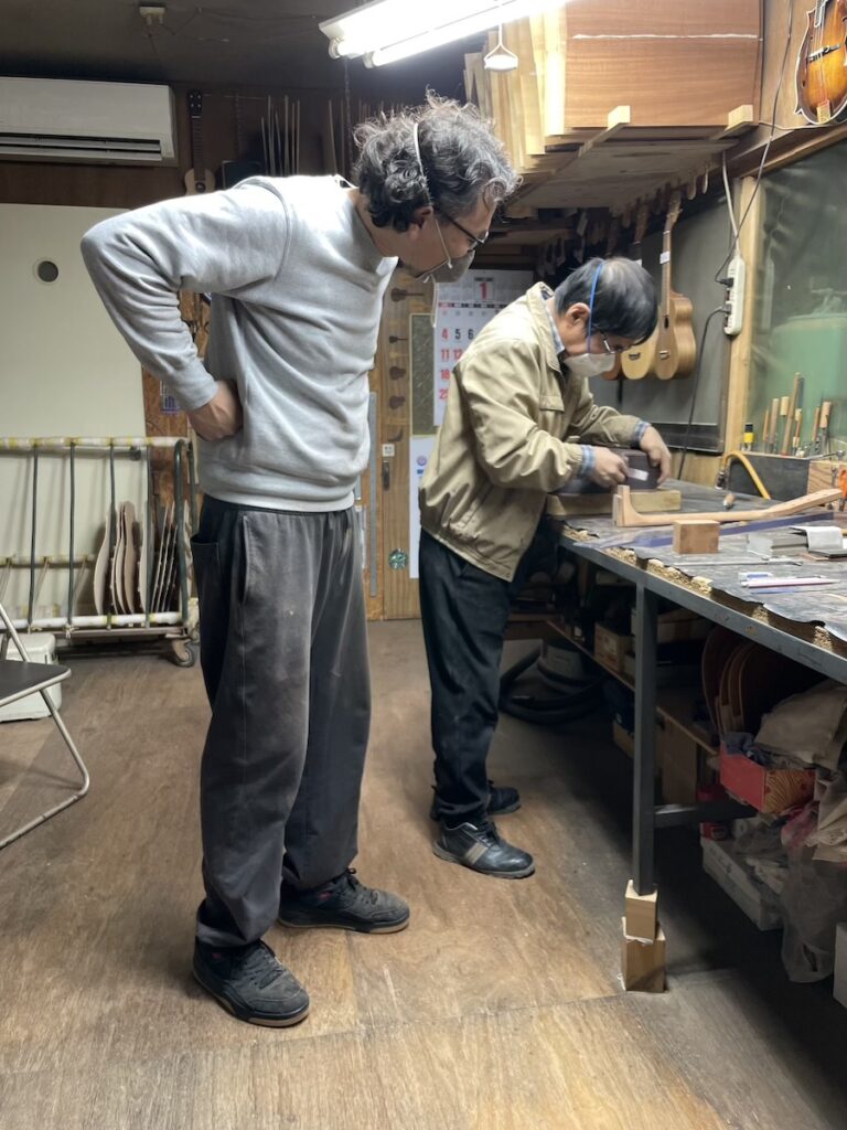 ネックの形をチェックしながら削っていきます。要所要所で師匠にチェックしてもらい、仕上げていきます。