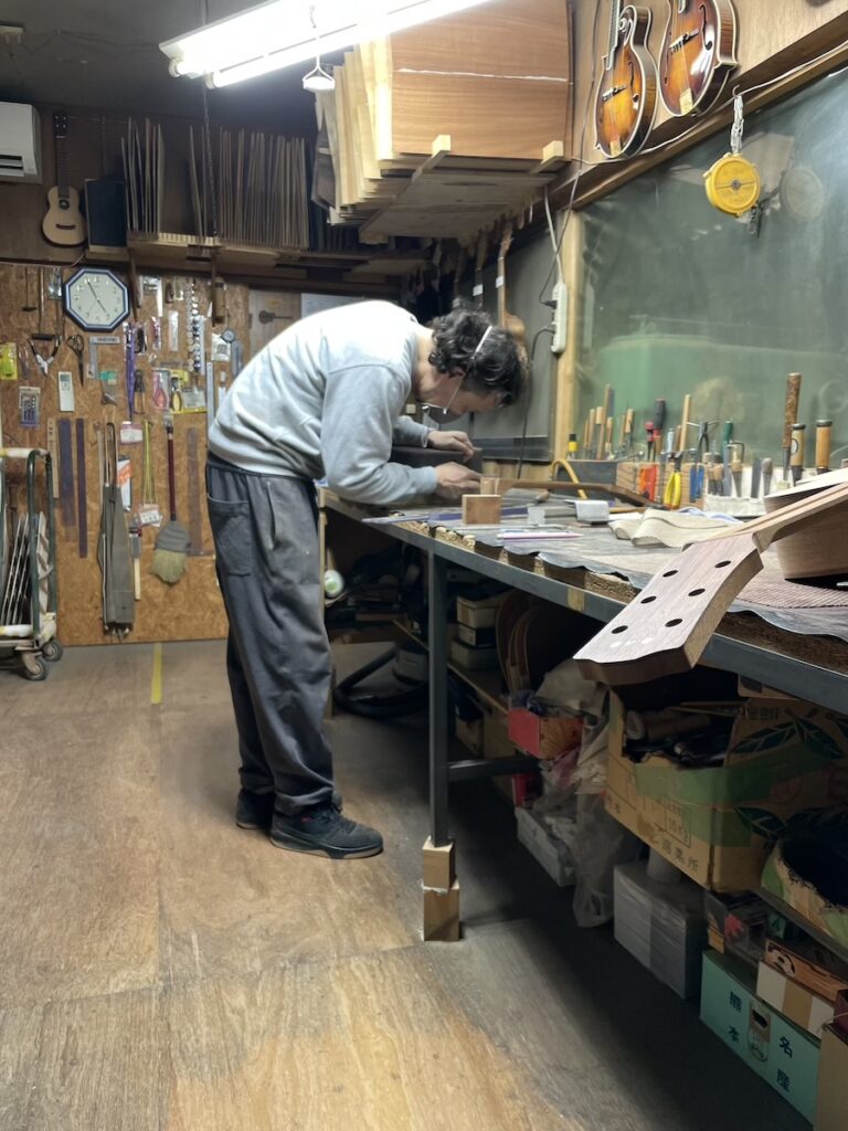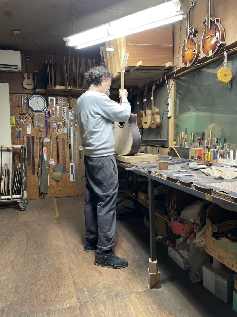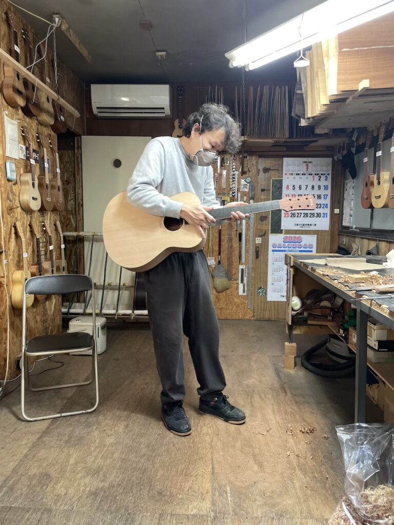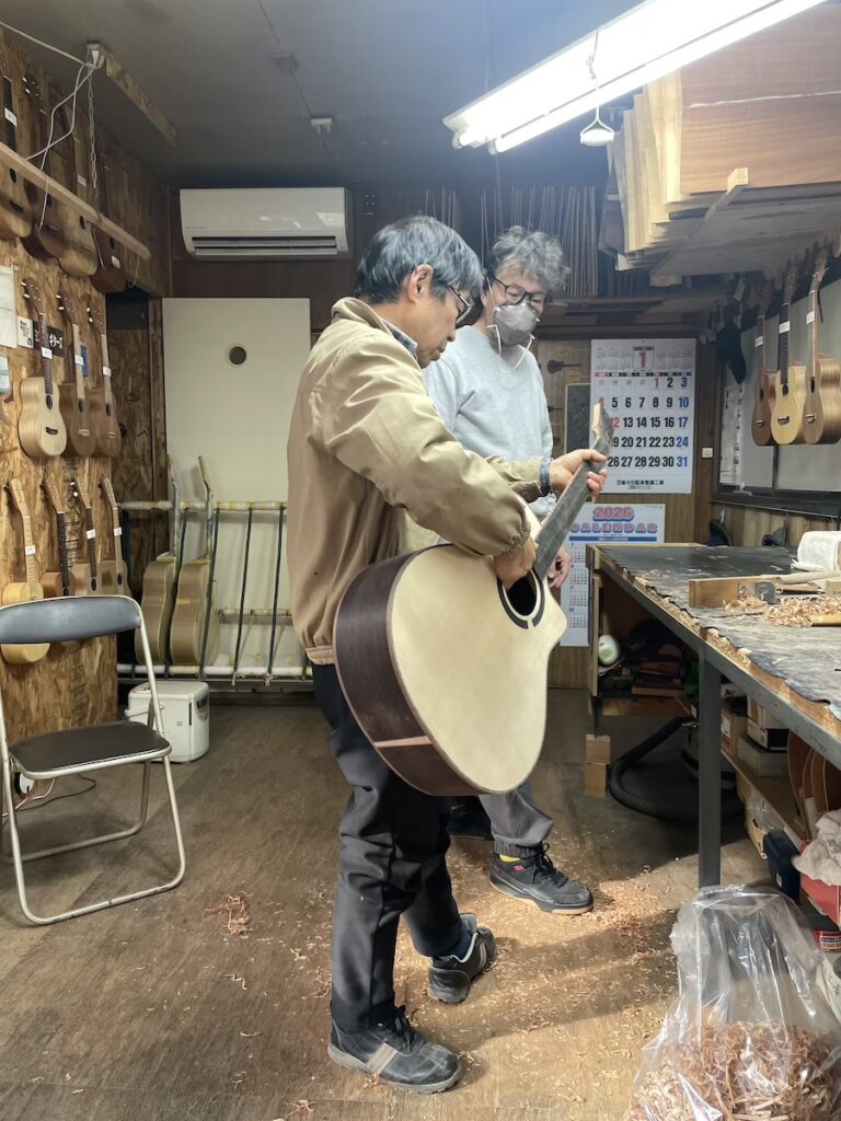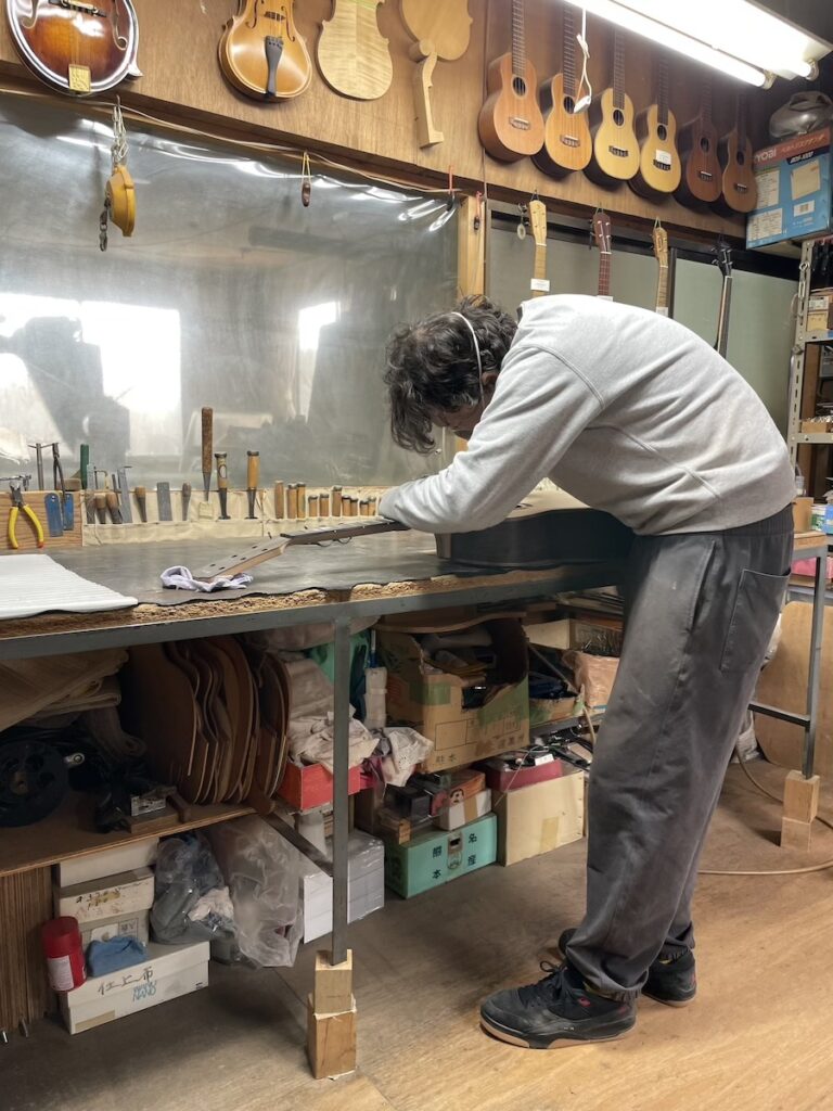 ネックの形をチェックしながら削っていきます。要所要所で師匠にチェックしてもらい、仕上げていきます。