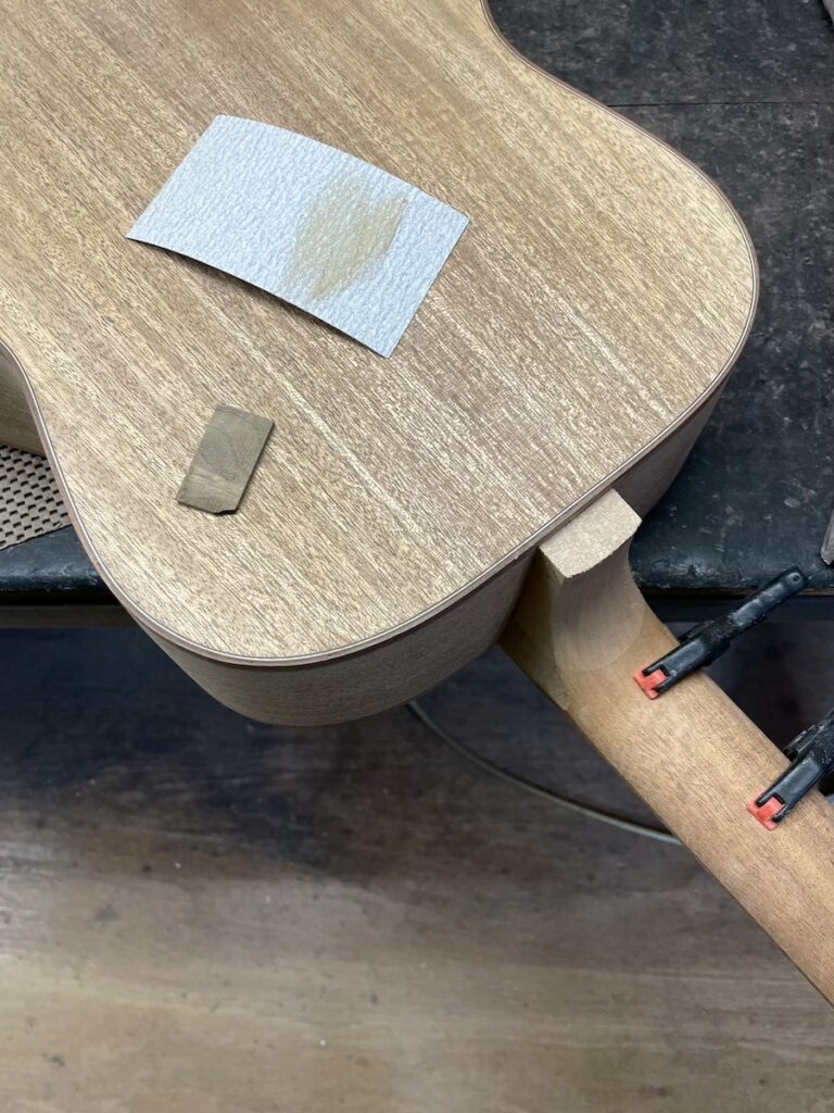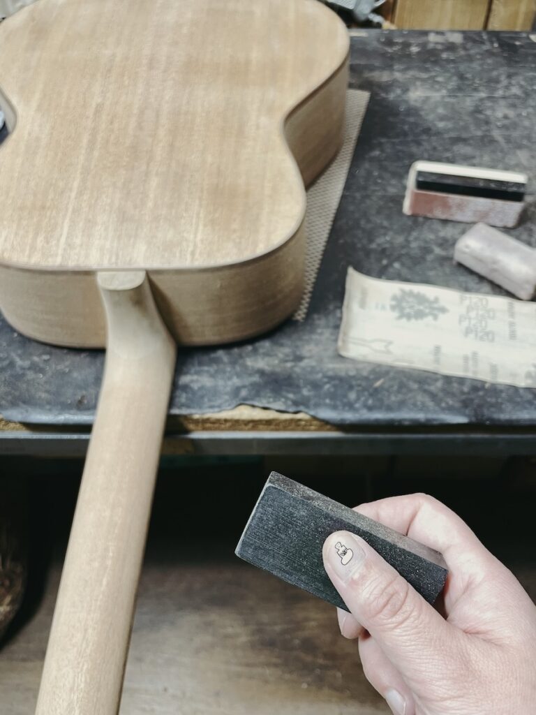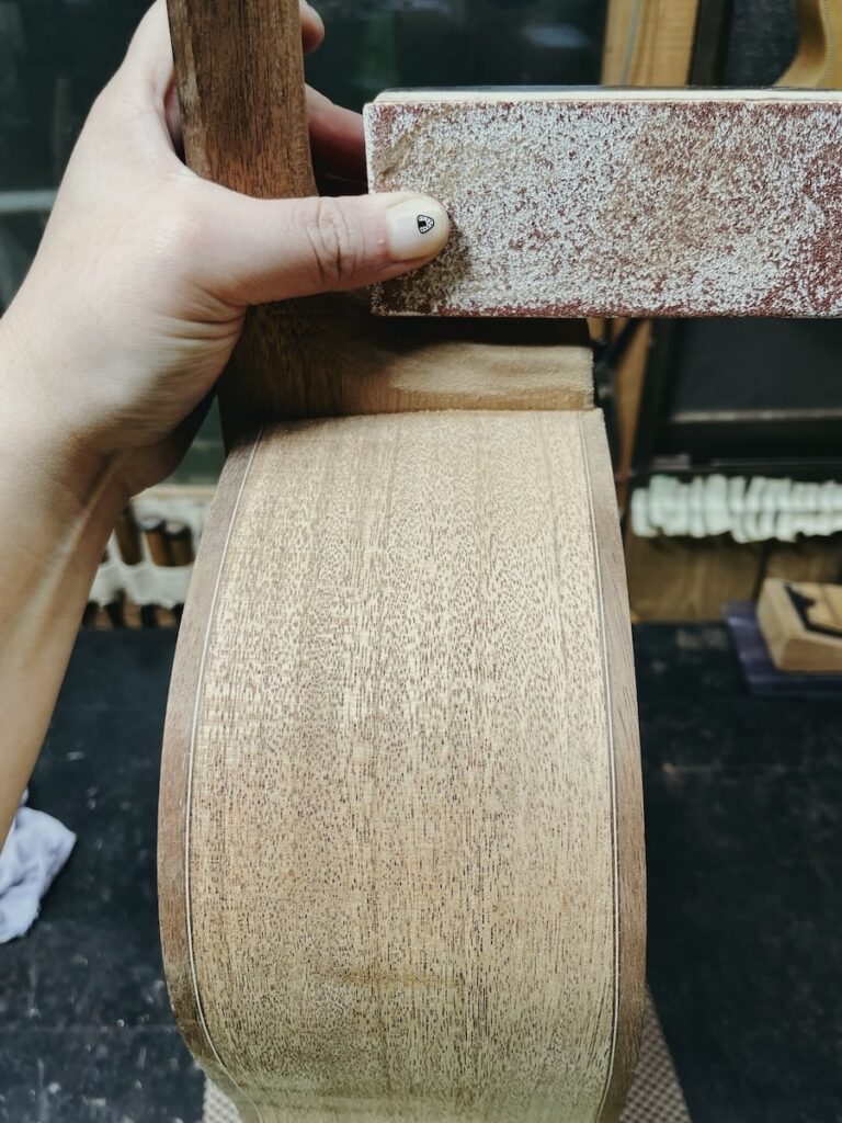ネックサンディングは、ペーパーの番手を変えながら、形を壊さないようにきれいに仕上げていきます。