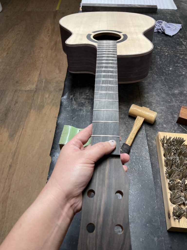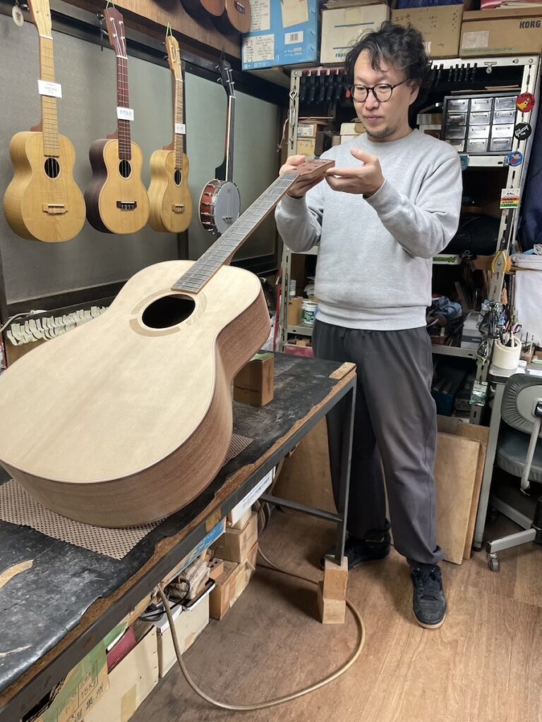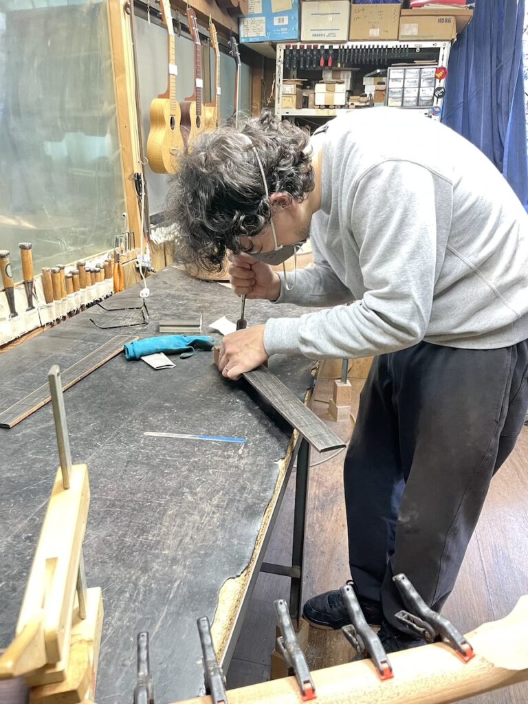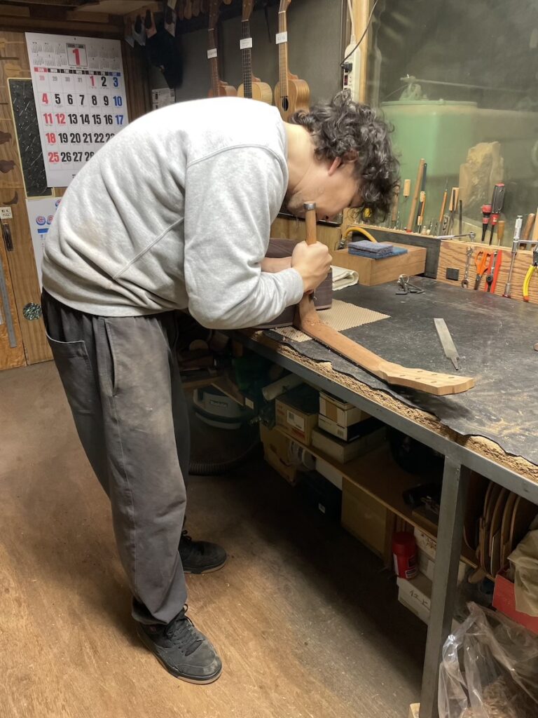 前回はウクレレ製作だったため、久しぶりのギターのフレット打ちでしたが、すぐに感覚を取り戻していました。