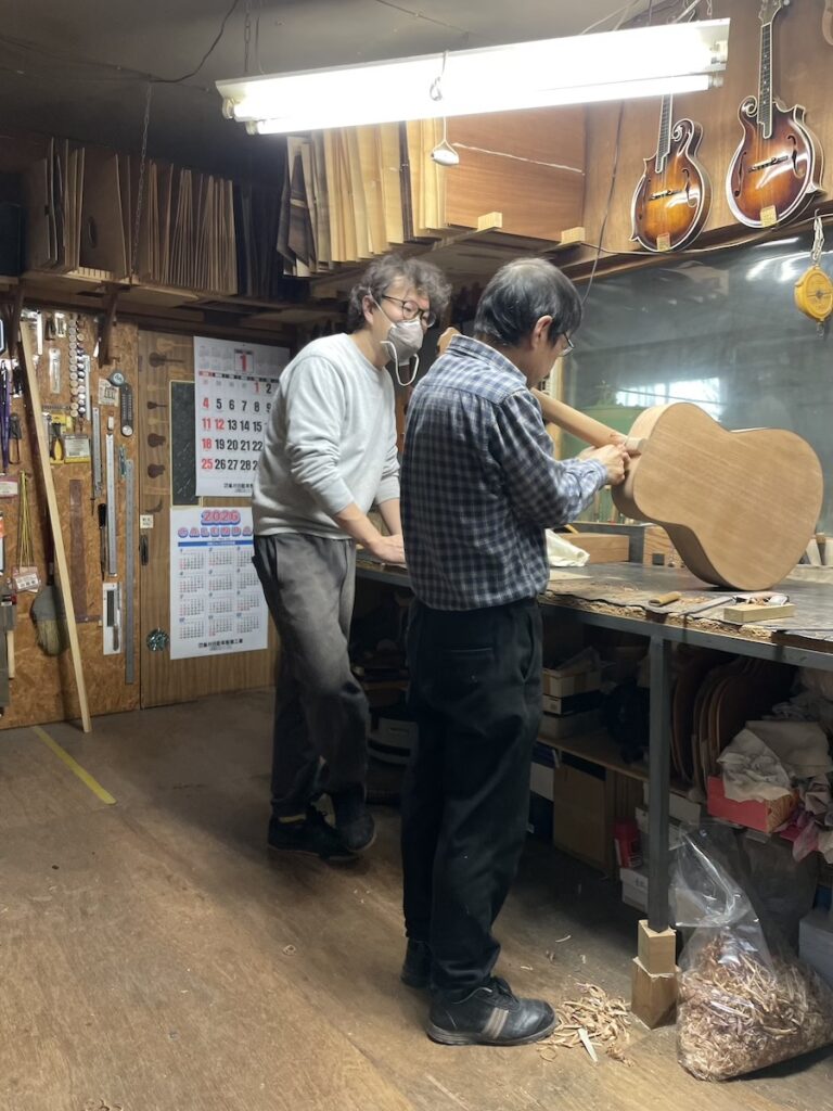 知明はネックを削り、美紀さんはサンディング作業です。