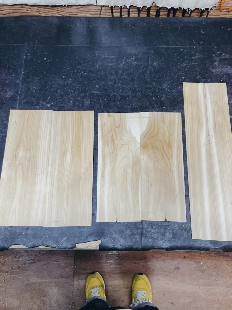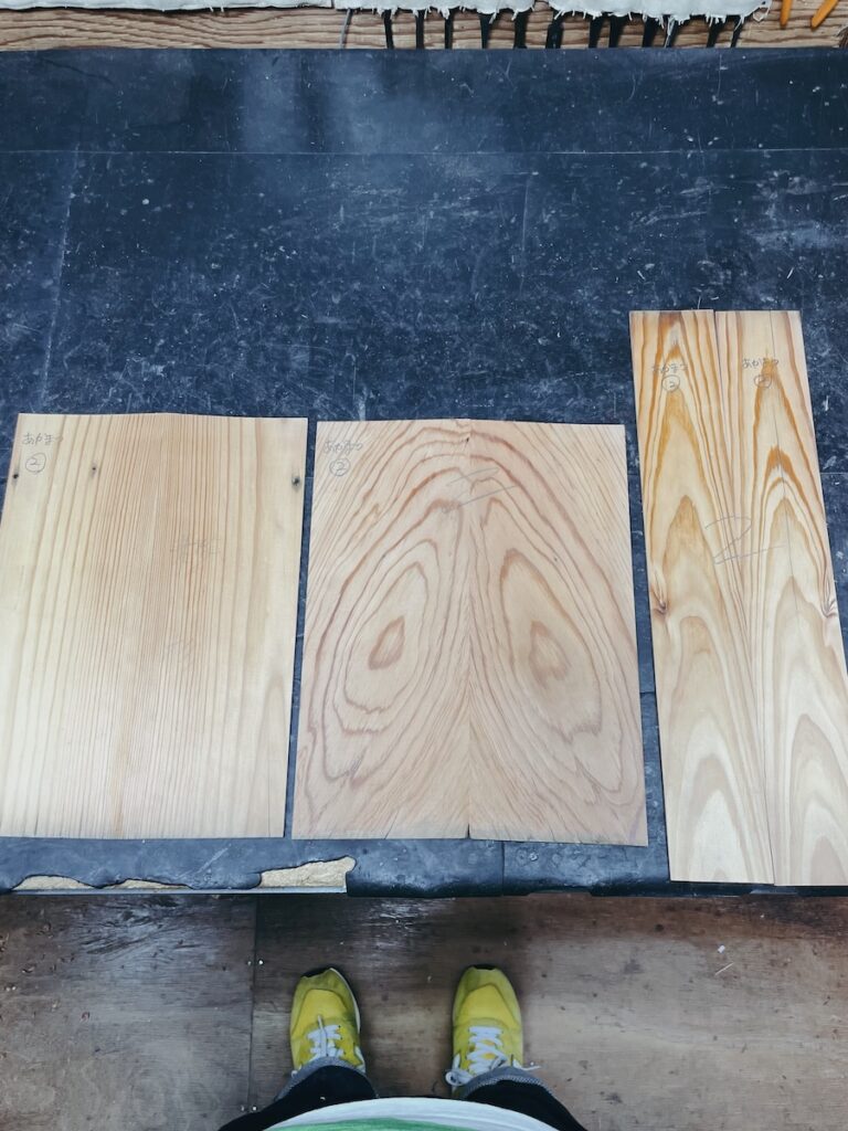 あかまつ、ひのき、けやき、桐材に加え、虫食いのある黒柿を師匠から譲っていただきました。せっかくの材料なので、ひとまず製作してみます。