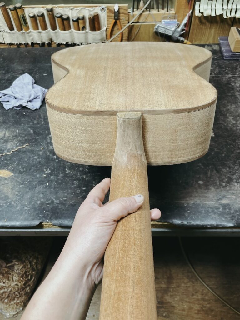 ボディとネックに溝の加工を施し、ジョイント部を合わせ込んでいきます。