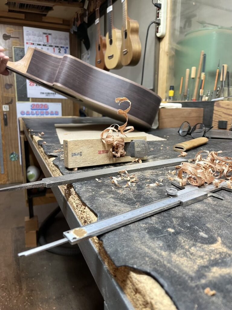 この日は、ネックヒールのカマティロ(とても硬い)を削ったところで作業終了。お疲れ様でした。