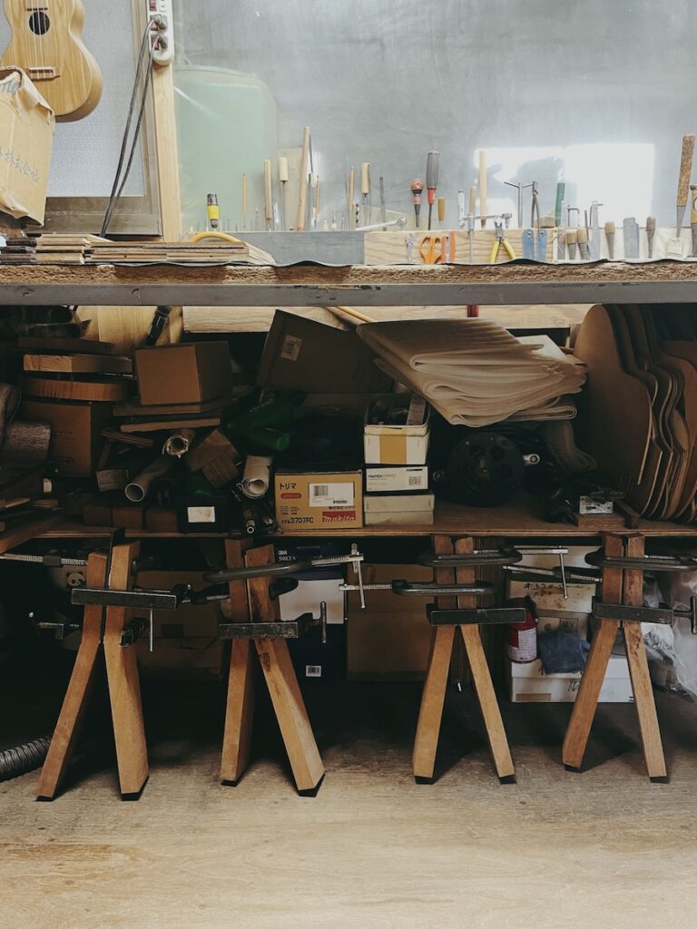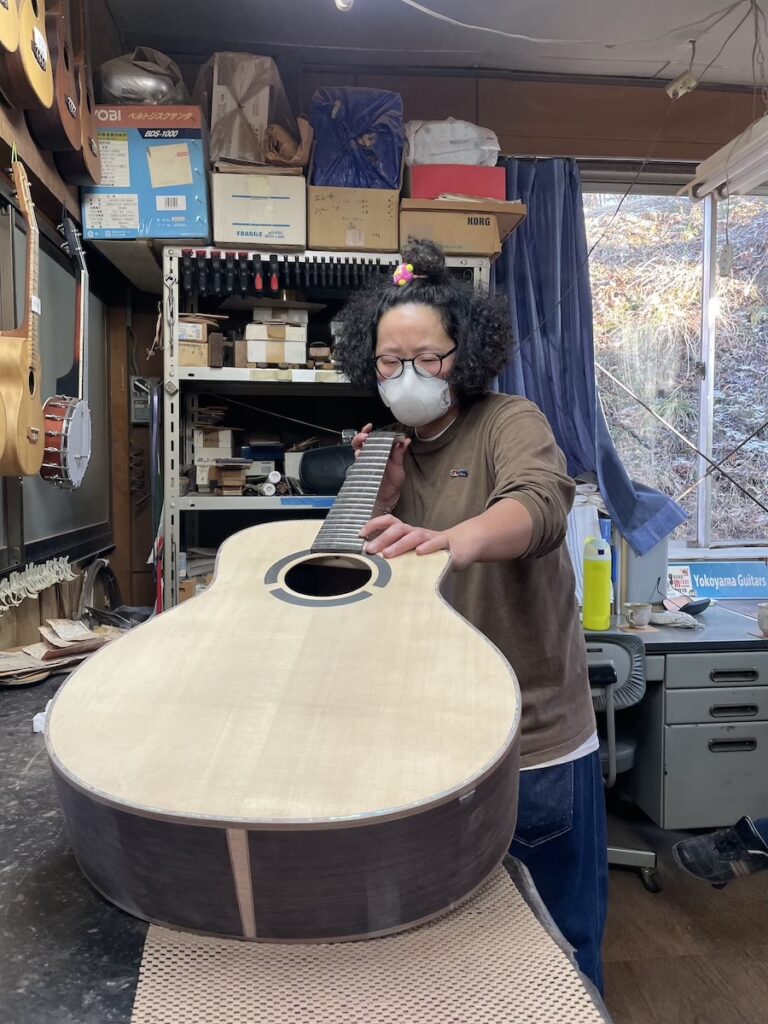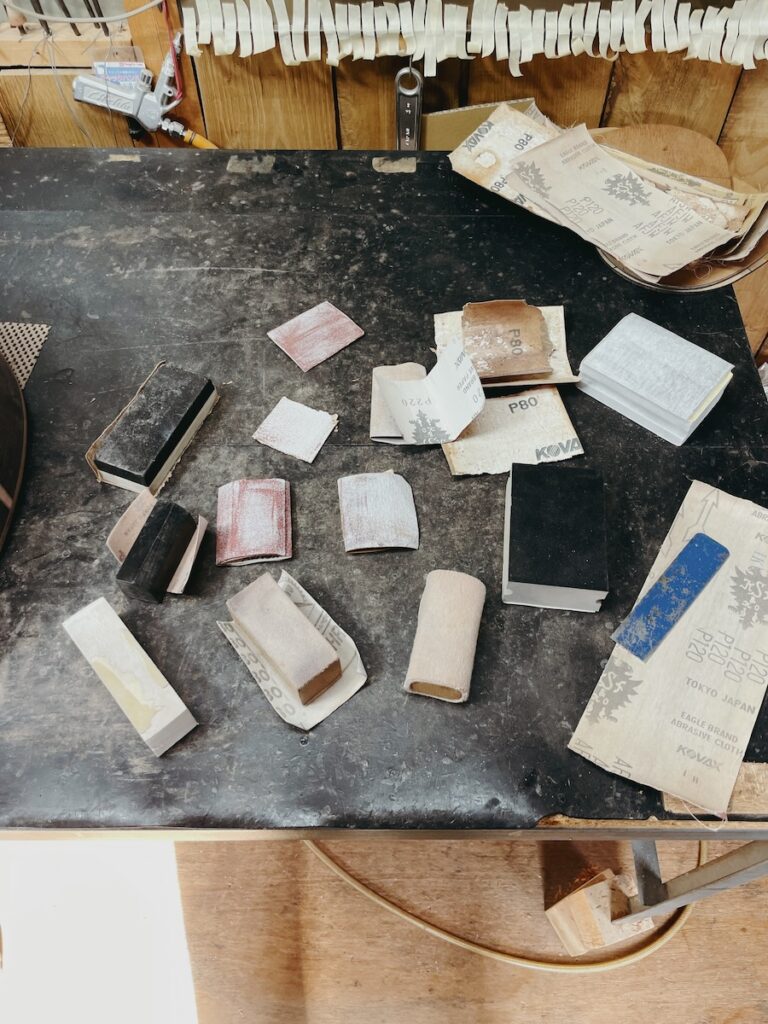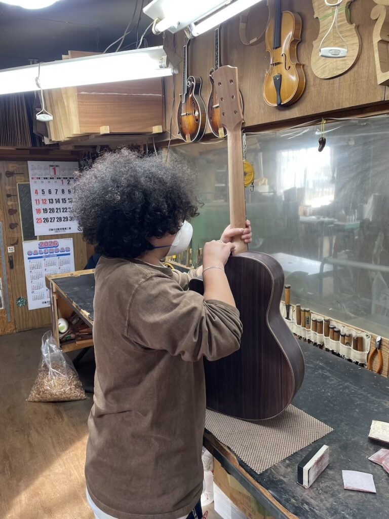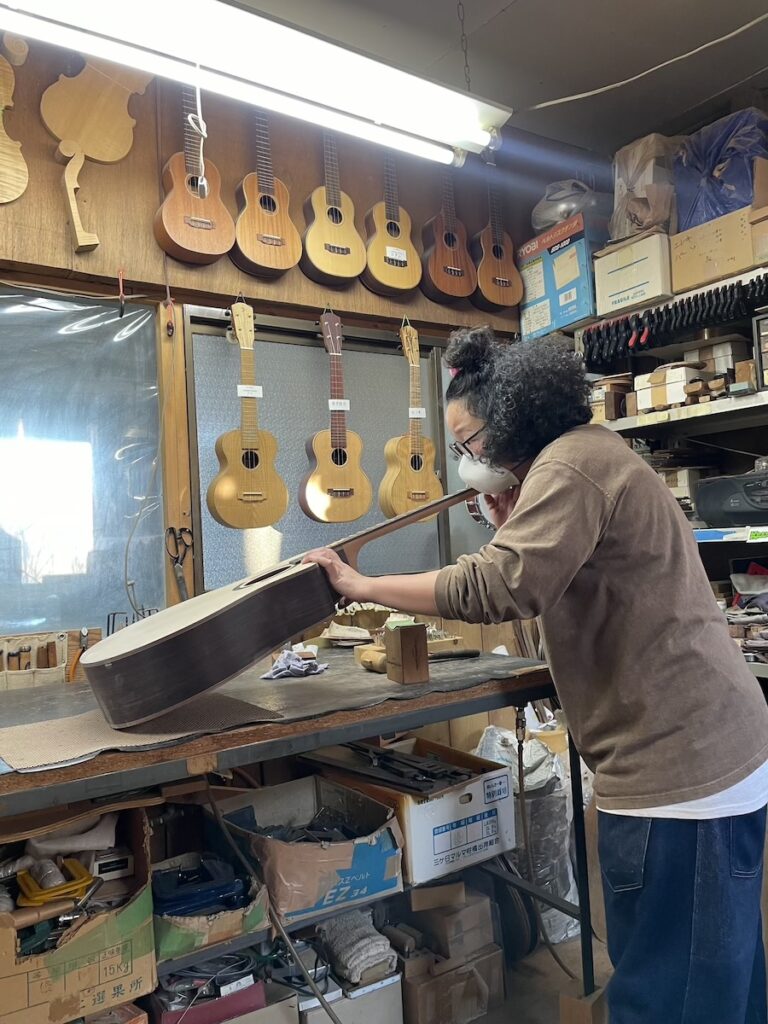 ネックを削り終わった個体から、ネックのサンディング作業に取り掛かります。この作業は、美紀さん担当です。