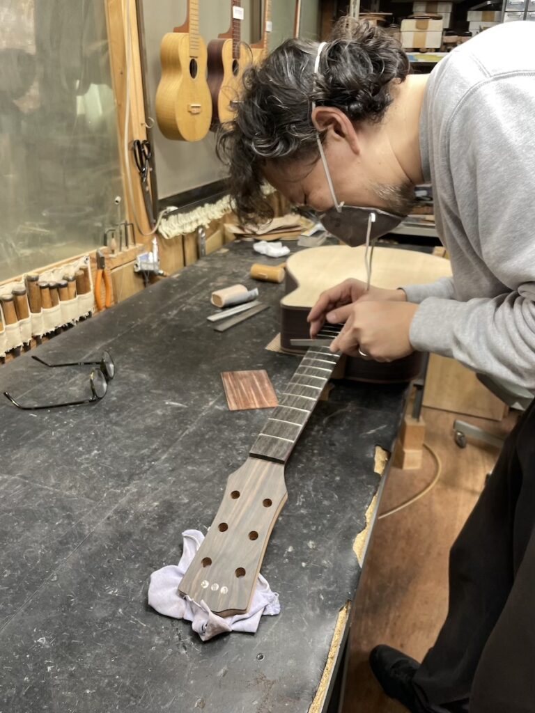 2本目のマホガニーモデルも順調に作業を進め、知明がフレットサイド処理を施します。