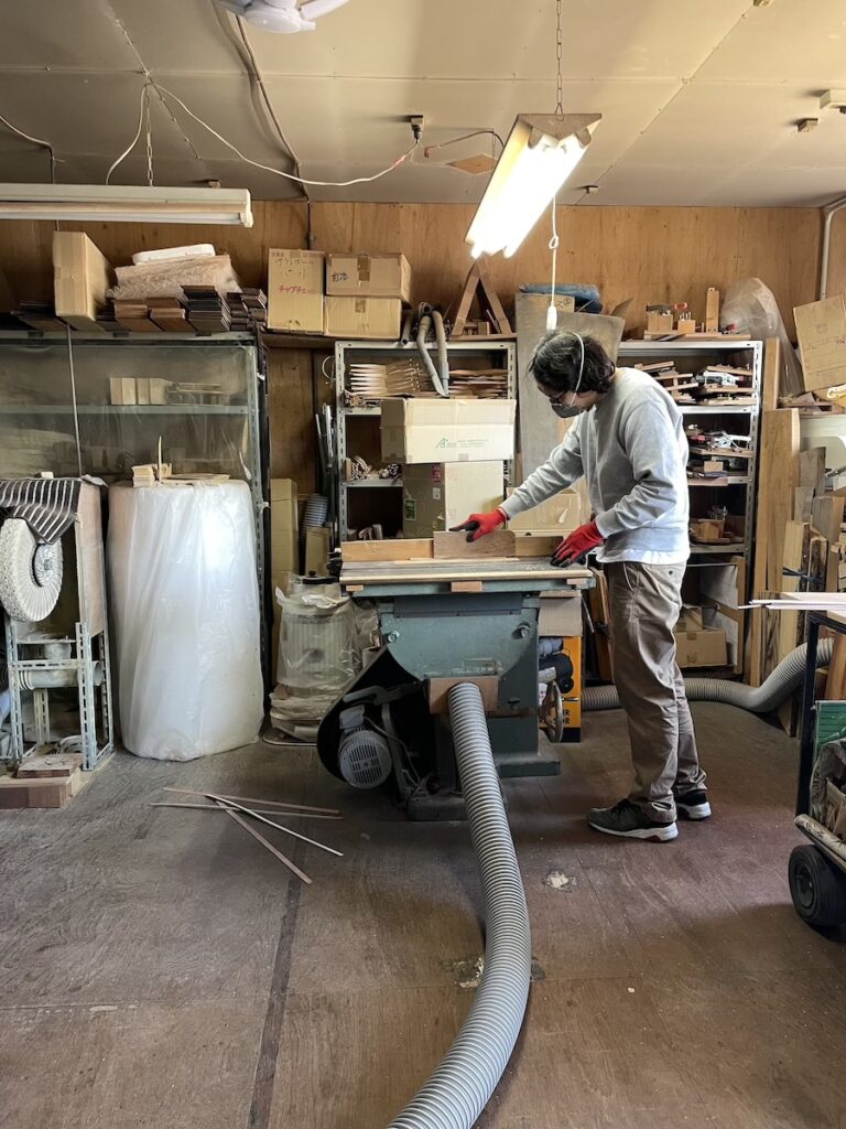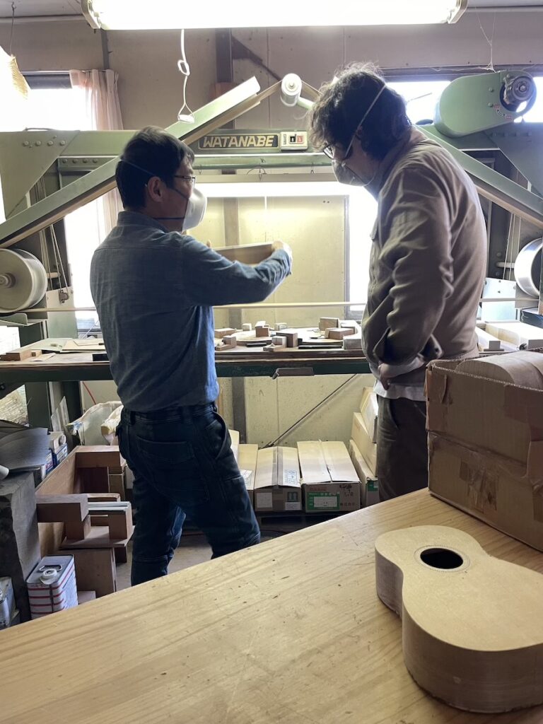 まずは、知明がライニング材をウクレレ用の幅に加工し、美紀さんが面取り作業を行います。