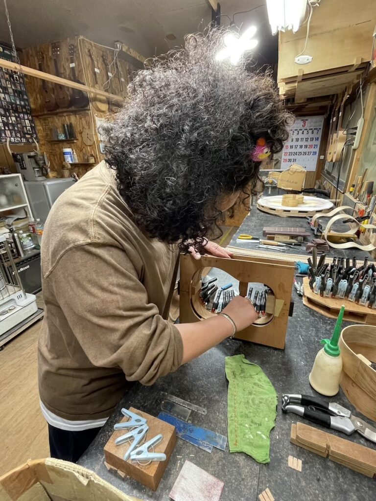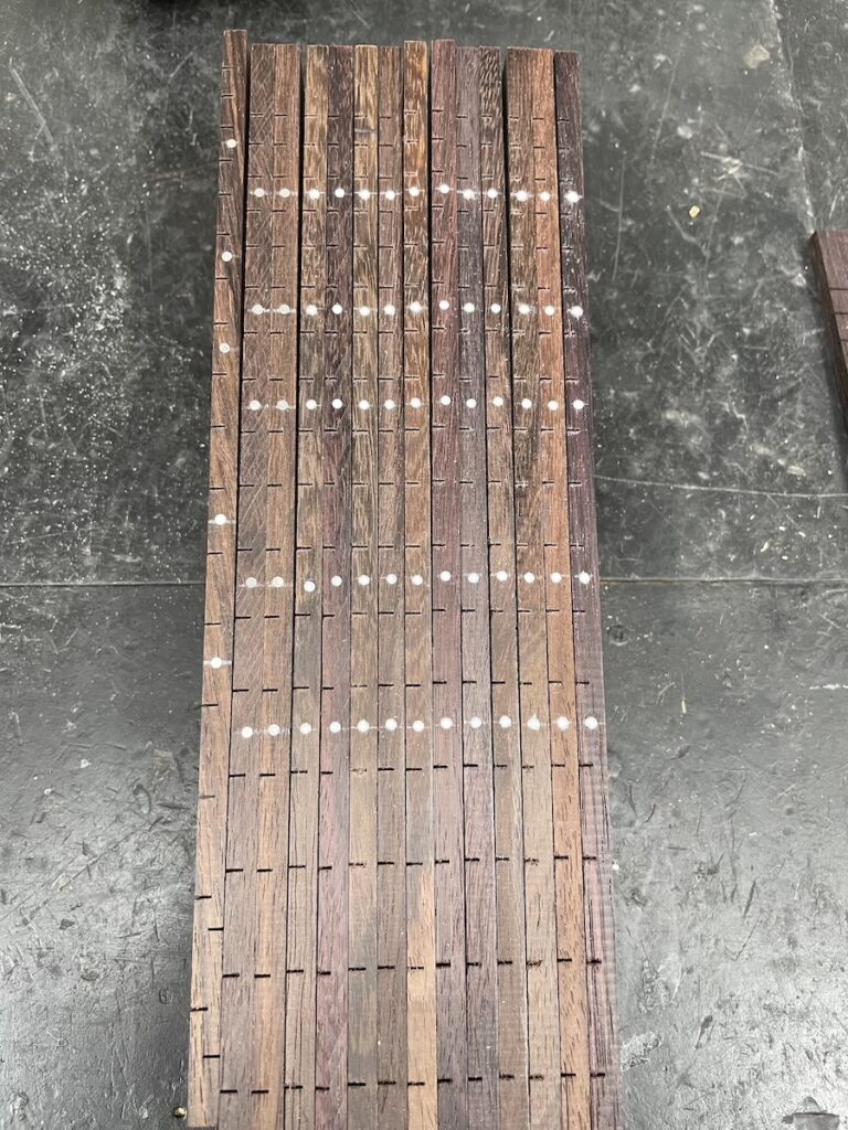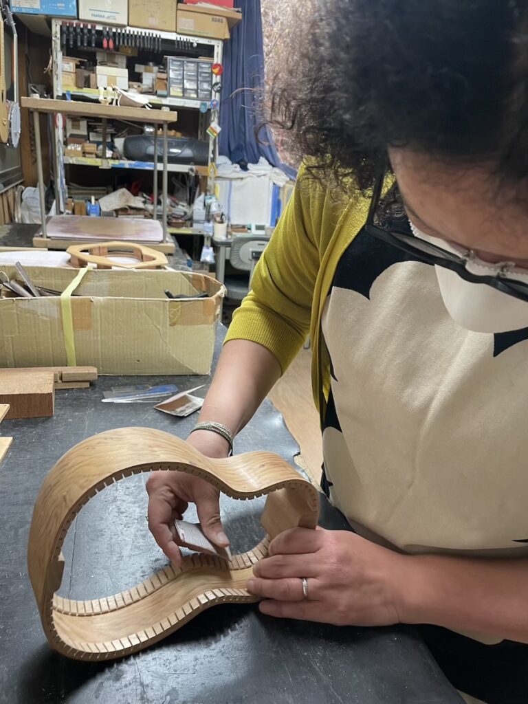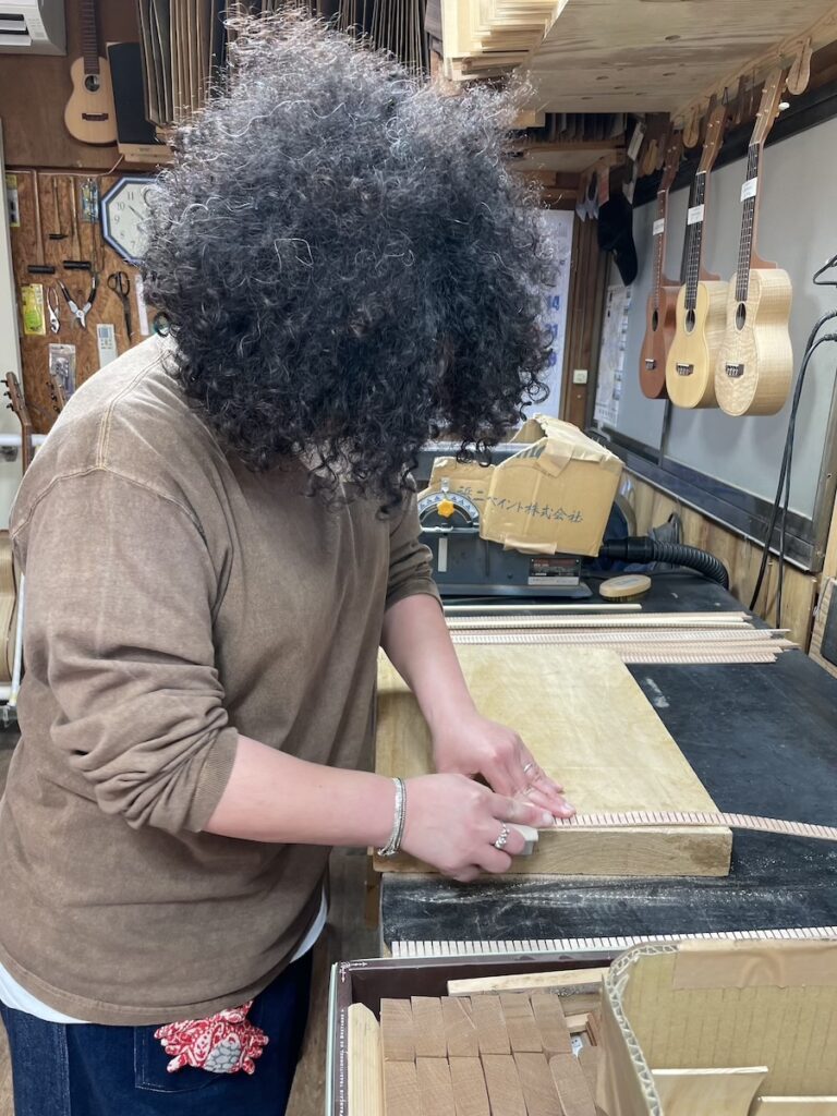 美紀さんはライニングの貼り付け作業に入ったので、知明は指板のフレット溝加工、サイドポジションマークの埋め込み作業を行います。