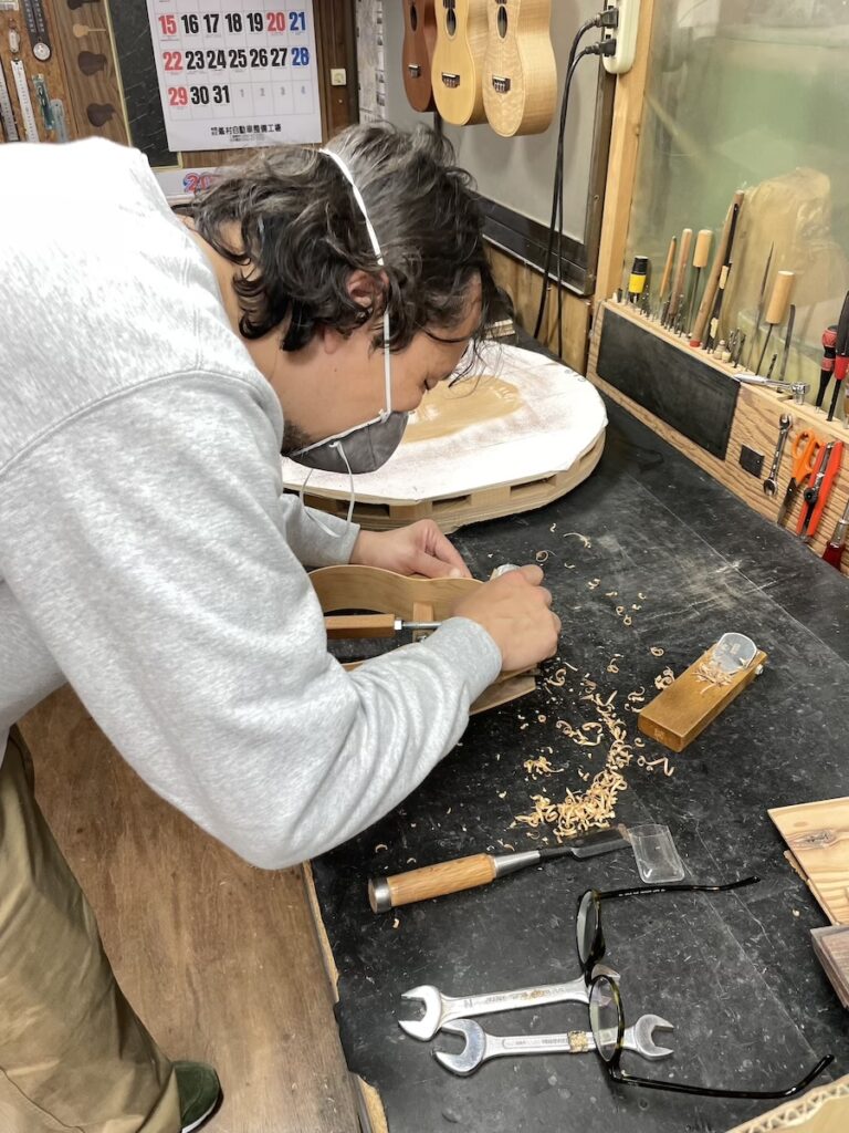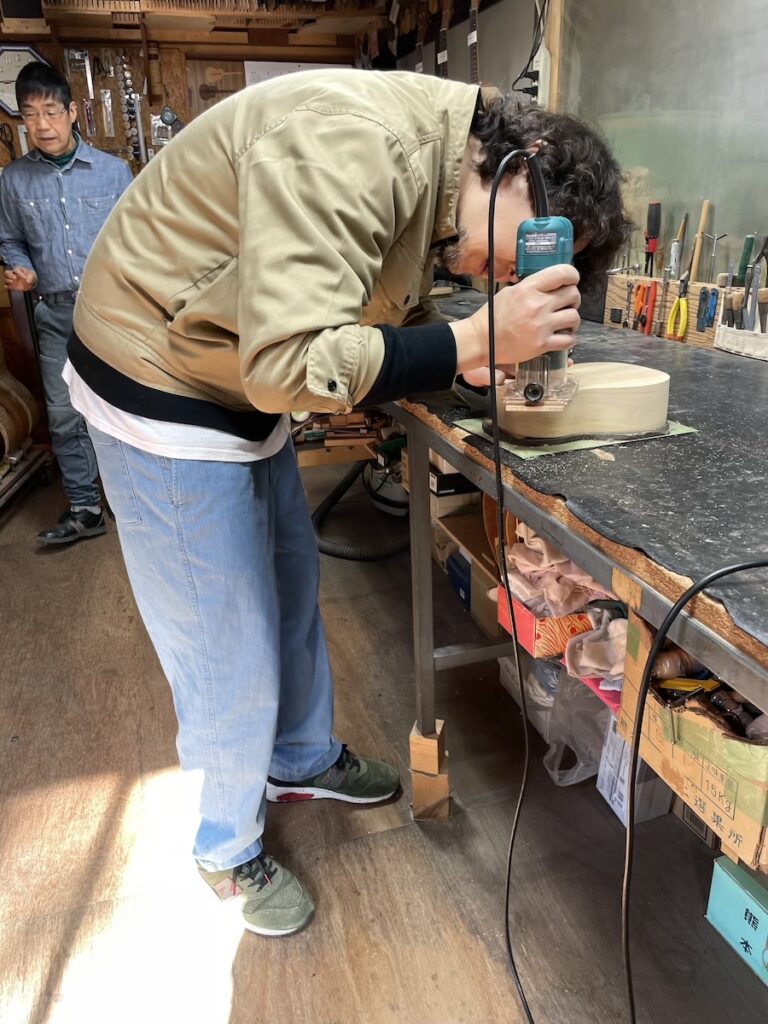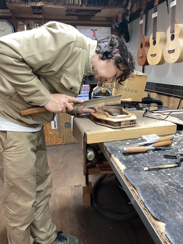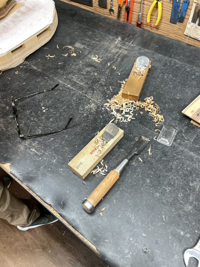 知明は鑿と鉋を使い、胴厚を仕上げていきます。