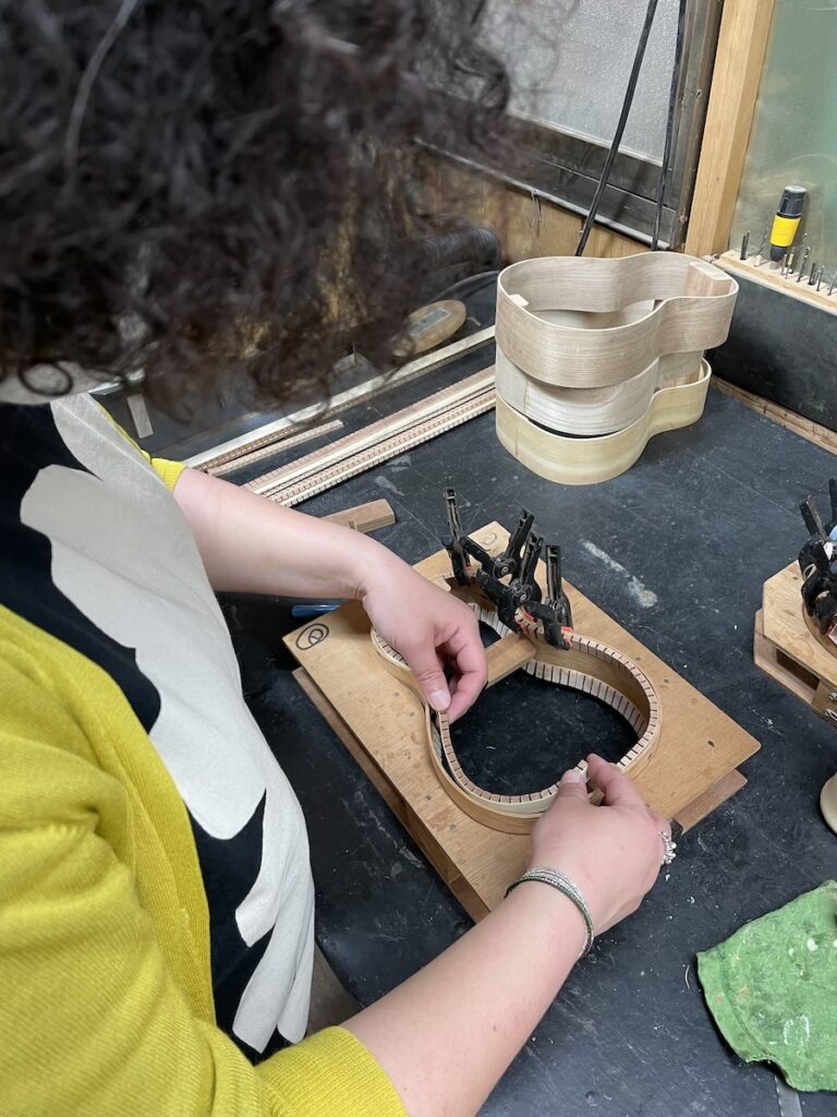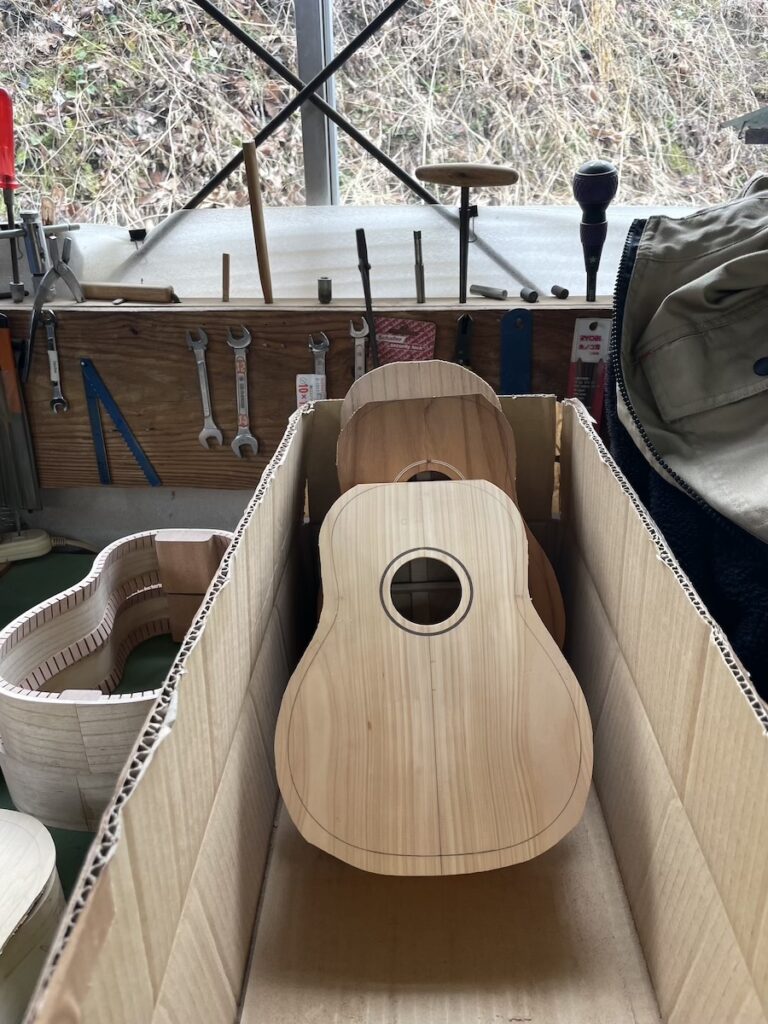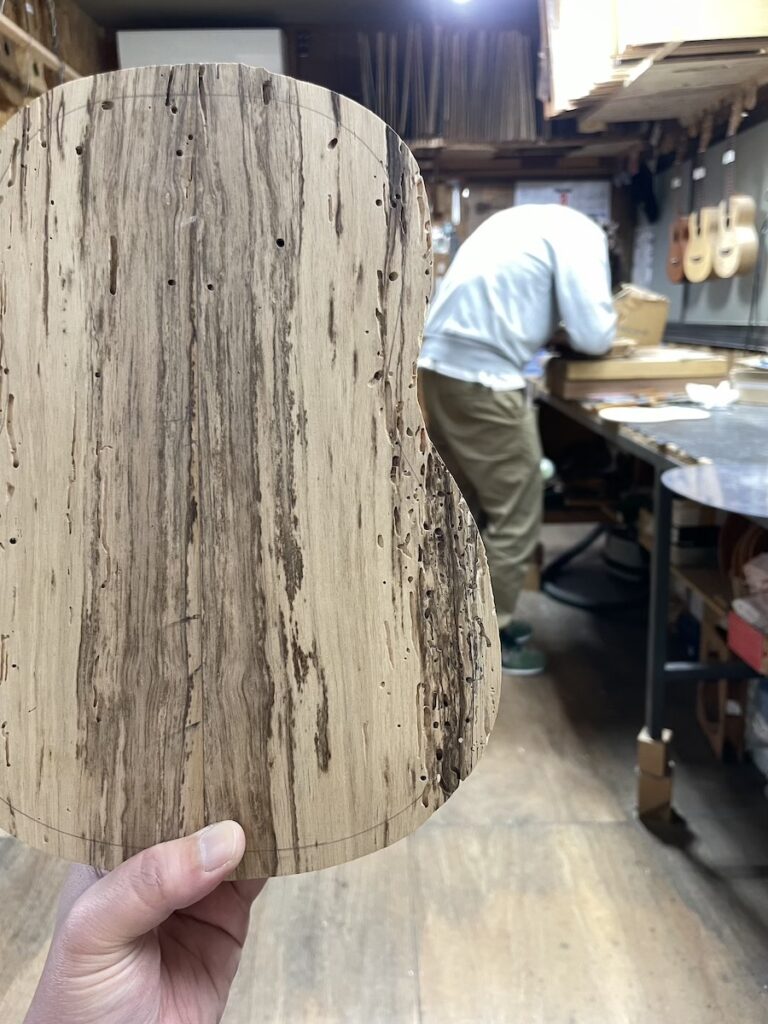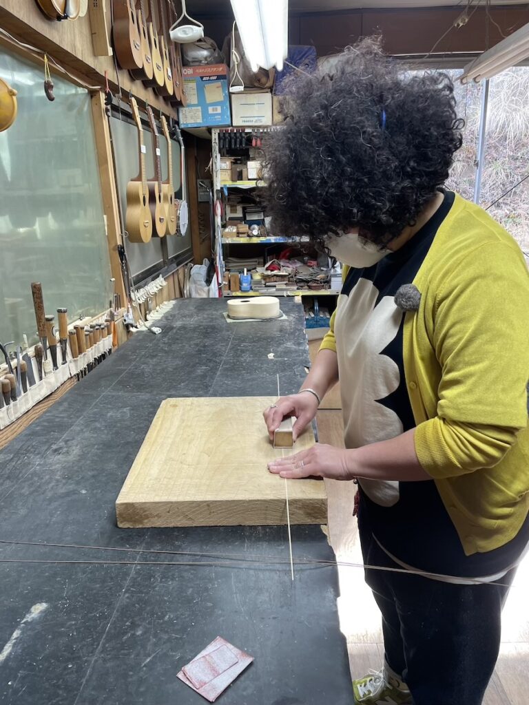 一本だけパーフリング埋め込み作業を進めようと、知明が溝を彫り、美紀さんは埋め込み材の準備です。
