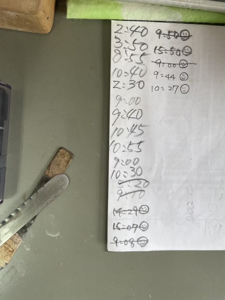 ライニングを貼り付けたら、時間を書き込んでおきます。色々な作業を同時進行していると、接着時間を忘れてしまうので要注意です。
