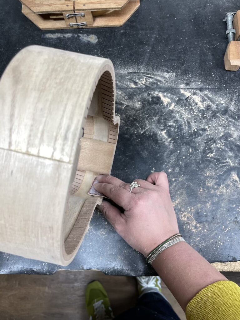 接着後の表甲、裏甲の余分な部分を落とし、ベルトサンダーできれいに仕上げます。