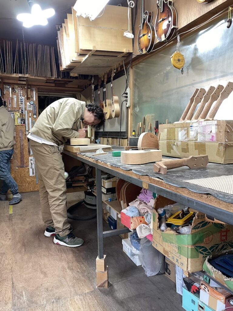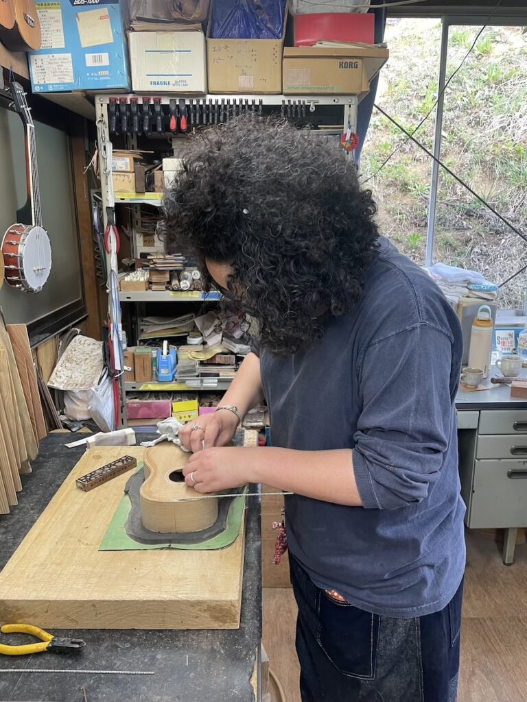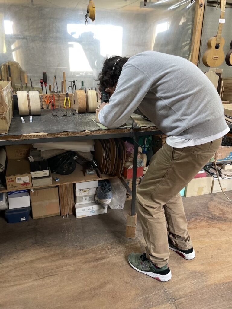 美紀さんはパーフリング埋め込み作業が終わり、ポジションマークを打ち込みます。