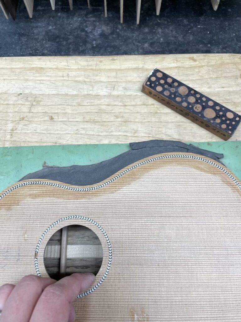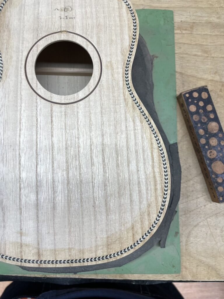 パーフリングを埋め込んだボディをサンディングします。