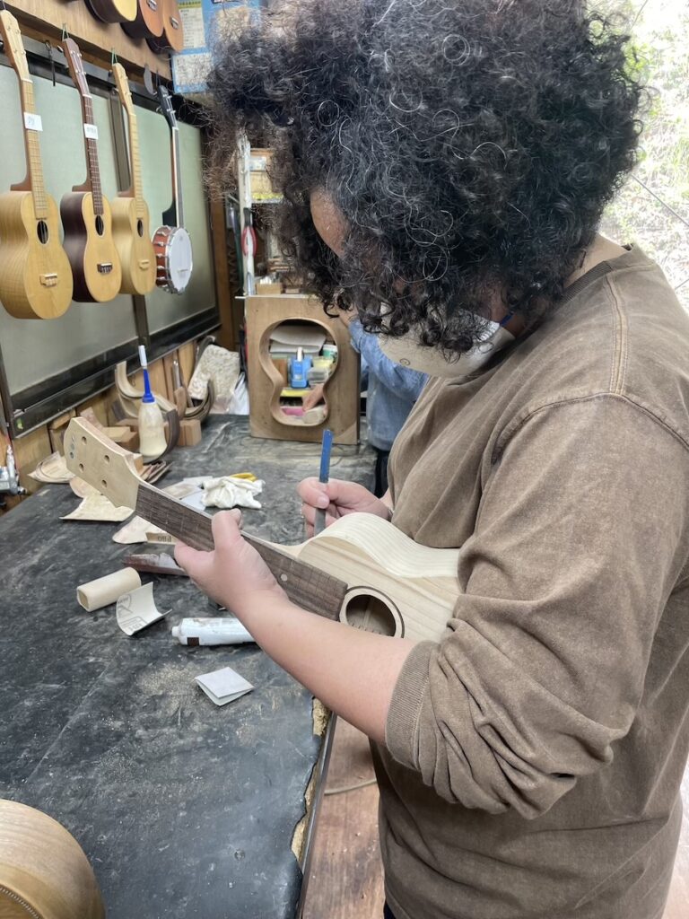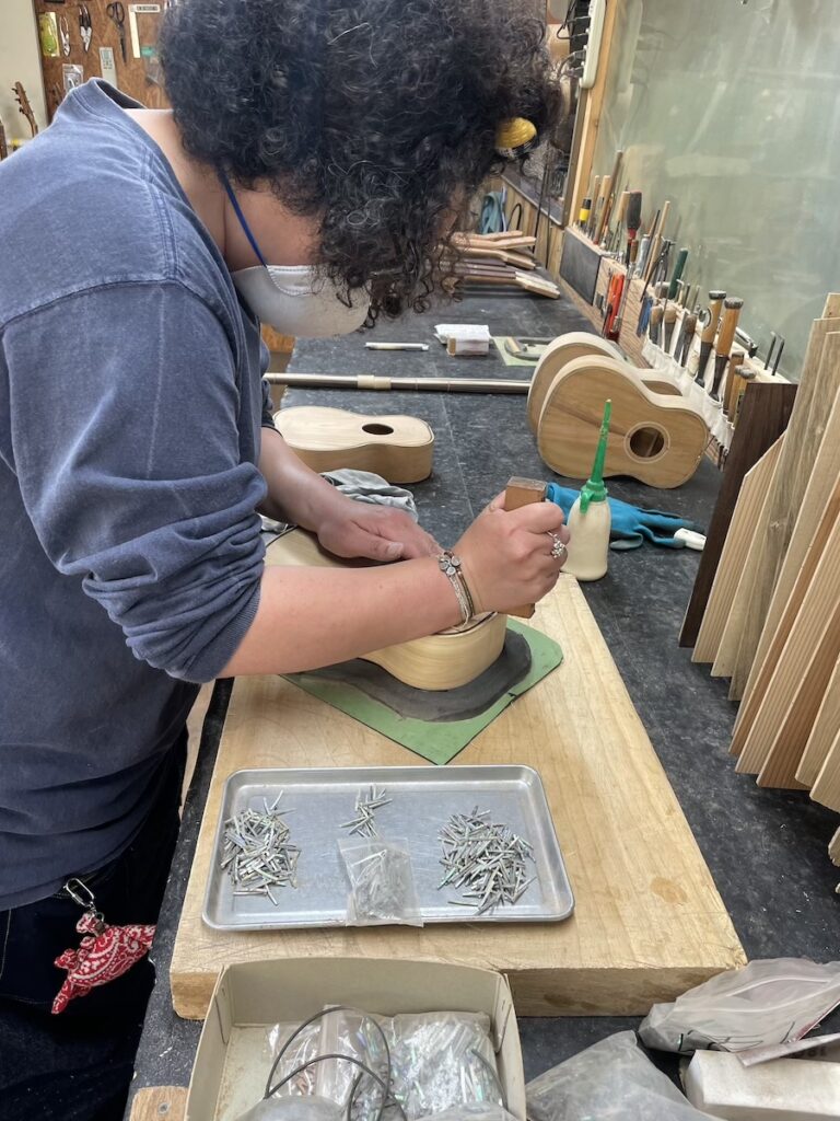 指板、ネックヒールキャップの接着も、作業分担して同時に進めます。