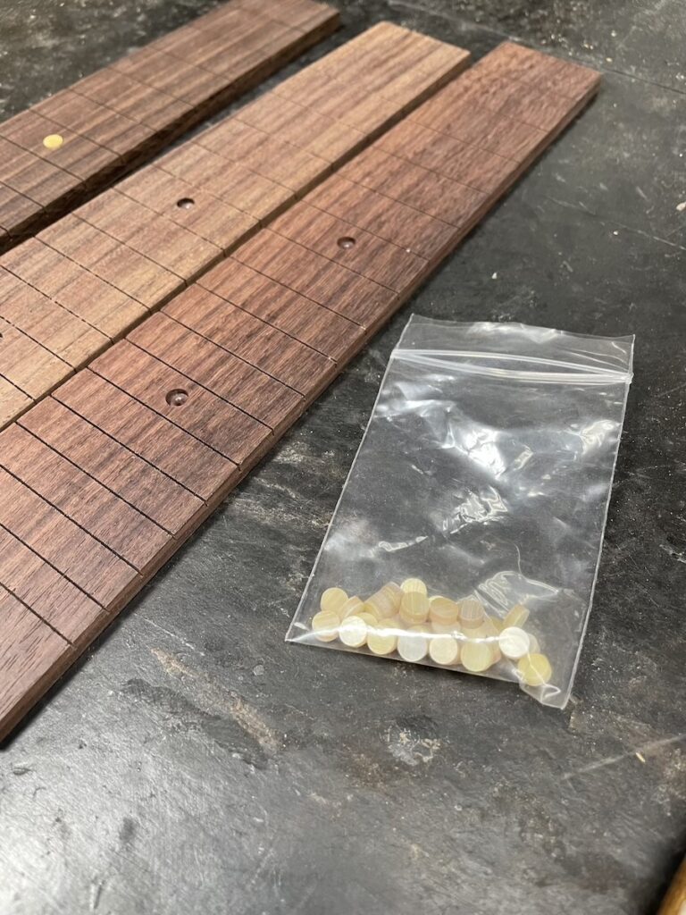知明が空いた時間で、指板ポジションマークの加工をします。